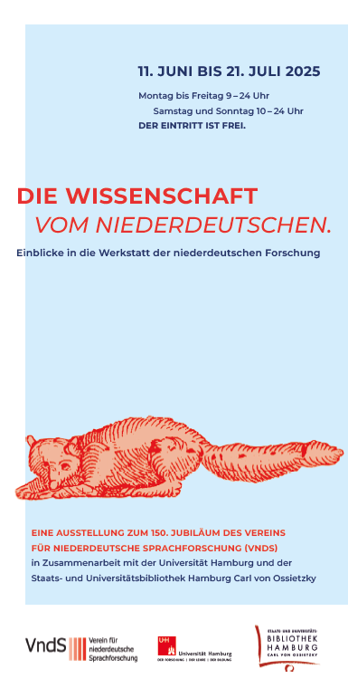 Seit 150 Jahren gibt es den Verein für niederdeutsche Sprachforschung, der in Hamburg gegründet wurde. Diesem Jubiläum ist eine Ausstellung gewidmet, die vielfältige Einblicke in die niederdeutsche Sprache, Literatur und deren Erforschung bietet, vom Mittelalter bis zur Gegenwart. Die Themen sind vielfältig: das „Hamburger Schiffsrecht“ und der „Reynke de Vos“, niederdeutsche Wörterbücher und Dialektatlanten, Sprachbiographieforschung und Norddeutsch in den Medien, Hamburger Straßennamen, Plattdeutsch in der Schule und vieles mehr.